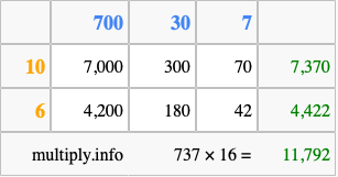 That's all there is to it! As you can see from the box above, the answer to 737 times 16 using the box method is 11,792.