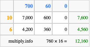 Below is an illustration showing you how to calculate 760 times 16 using the box method, using the instructions above.