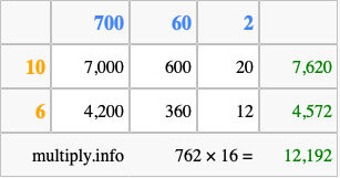 Below is an illustration showing you how to calculate 762 times 16 using the box method, using the instructions above.