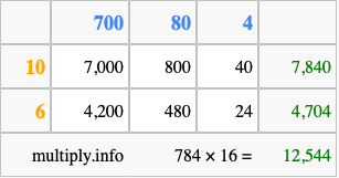 Finally, we add up all the sums we found in step 3 to get our final answer to 784 times 16.