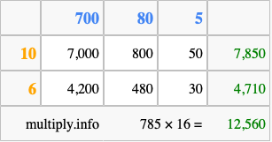 Finally, we add up all the sums we found in step 3 to get our final answer to 785 times 16.
