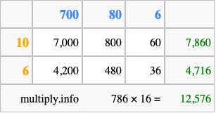 Below is an illustration showing you how to calculate 786 times 16 using the box method, using the instructions above.