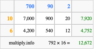 Below is an illustration showing you how to calculate 792 times 16 using the box method, using the instructions above.