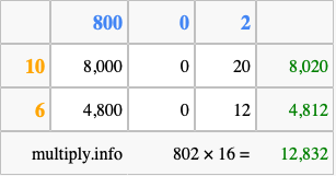 That's all there is to it! As you can see from the box above, the answer to 802 times 16 using the box method is 12,832.