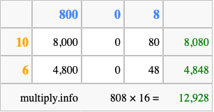 That's all there is to it! As you can see from the box above, the answer to 808 times 16 using the box method is 12,928.