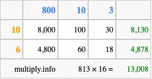 Below is an illustration showing you how to calculate 813 times 16 using the box method, using the instructions above.