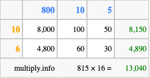 Below is an illustration showing you how to calculate 815 times 16 using the box method, using the instructions above.