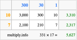 Below is an illustration showing you how to calculate 331 times 17 using the box method, using the instructions above.