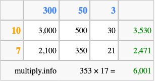 Below is an illustration showing you how to calculate 353 times 17 using the box method, using the instructions above.