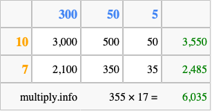 Finally, we add up all the sums we found in step 3 to get our final answer to 355 times 17.