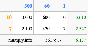 Finally, we add up all the sums we found in step 3 to get our final answer to 361 times 17.