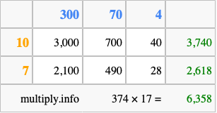 Finally, we add up all the sums we found in step 3 to get our final answer to 374 times 17.