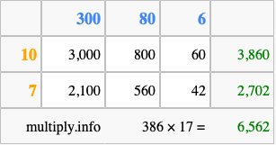 Finally, we add up all the sums we found in step 3 to get our final answer to 386 times 17.
