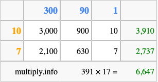 Finally, we add up all the sums we found in step 3 to get our final answer to 391 times 17.