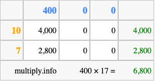 That's all there is to it! As you can see from the box above, the answer to 400 times 17 using the box method is 6,800.