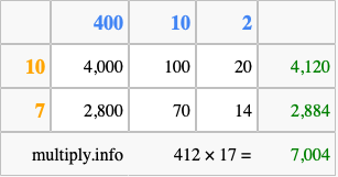 Finally, we add up all the sums we found in step 3 to get our final answer to 412 times 17.