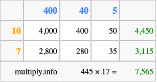 Finally, we add up all the sums we found in step 3 to get our final answer to 445 times 17.