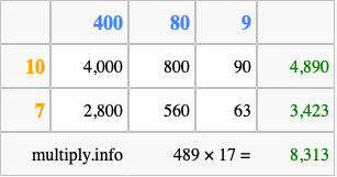 That's all there is to it! As you can see from the box above, the answer to 489 times 17 using the box method is 8,313.