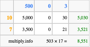 Below is an illustration showing you how to calculate 503 times 17 using the box method, using the instructions above.