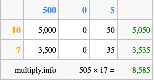 Below is an illustration showing you how to calculate 505 times 17 using the box method, using the instructions above.