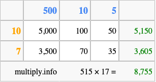 Below is an illustration showing you how to calculate 515 times 17 using the box method, using the instructions above.