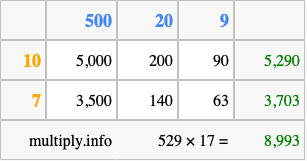 Below is an illustration showing you how to calculate 529 times 17 using the box method, using the instructions above.