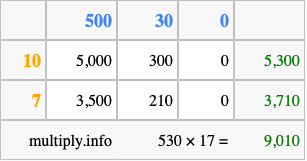 Below is an illustration showing you how to calculate 530 times 17 using the box method, using the instructions above.