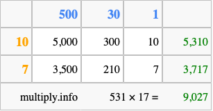 Below is an illustration showing you how to calculate 531 times 17 using the box method, using the instructions above.