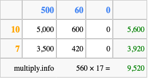 Below is an illustration showing you how to calculate 560 times 17 using the box method, using the instructions above.