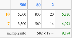 Below is an illustration showing you how to calculate 582 times 17 using the box method, using the instructions above.