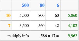 Finally, we add up all the sums we found in step 3 to get our final answer to 586 times 17.
