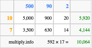 Below is an illustration showing you how to calculate 592 times 17 using the box method, using the instructions above.