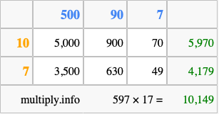 Finally, we add up all the sums we found in step 3 to get our final answer to 597 times 17.
