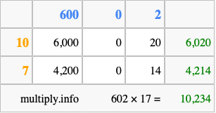 That's all there is to it! As you can see from the box above, the answer to 602 times 17 using the box method is 10,234.