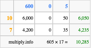 Finally, we add up all the sums we found in step 3 to get our final answer to 605 times 17.