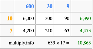 Finally, we add up all the sums we found in step 3 to get our final answer to 639 times 17.