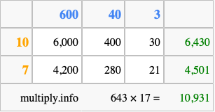 That's all there is to it! As you can see from the box above, the answer to 643 times 17 using the box method is 10,931.