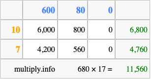 Below is an illustration showing you how to calculate 680 times 17 using the box method, using the instructions above.
