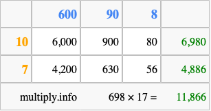Below is an illustration showing you how to calculate 698 times 17 using the box method, using the instructions above.