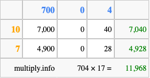 Below is an illustration showing you how to calculate 704 times 17 using the box method, using the instructions above.