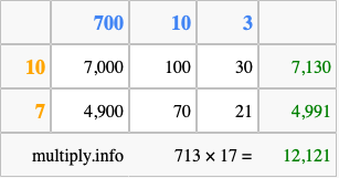 That's all there is to it! As you can see from the box above, the answer to 713 times 17 using the box method is 12,121.