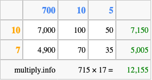 Below is an illustration showing you how to calculate 715 times 17 using the box method, using the instructions above.