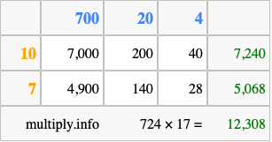 Finally, we add up all the sums we found in step 3 to get our final answer to 724 times 17.