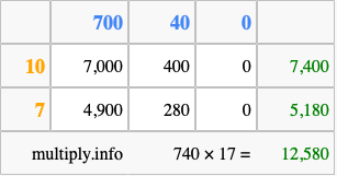 Finally, we add up all the sums we found in step 3 to get our final answer to 740 times 17.