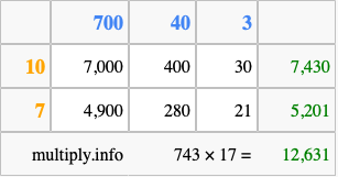 Below is an illustration showing you how to calculate 743 times 17 using the box method, using the instructions above.