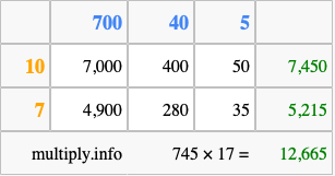 Below is an illustration showing you how to calculate 745 times 17 using the box method, using the instructions above.