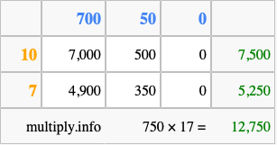 Finally, we add up all the sums we found in step 3 to get our final answer to 750 times 17.