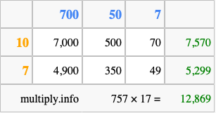 Finally, we add up all the sums we found in step 3 to get our final answer to 757 times 17.