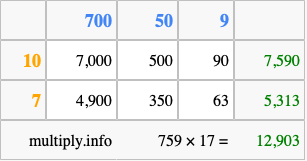 Finally, we add up all the sums we found in step 3 to get our final answer to 759 times 17.