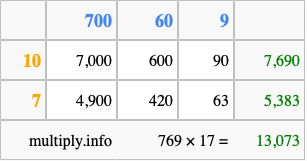 Finally, we add up all the sums we found in step 3 to get our final answer to 769 times 17.